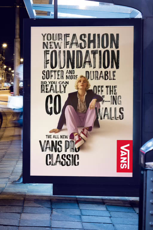 APPROACH: Off the F***ing Walls - Gen Z is a generation that defines itself in opposition to those who came before and reject the idea of one "mainstream" pop culture; Individualism is the key to their fashion choices. Gen Z is constantly reworking and modifying the old, the vintage, and the classic into something new and better. The Vans Pro Classic do just that, utilising their classic design but improving function, comfort, and disability. The shoes are as versatile and multifaceted as Gen Z, a perfect combo, no matter who you are.